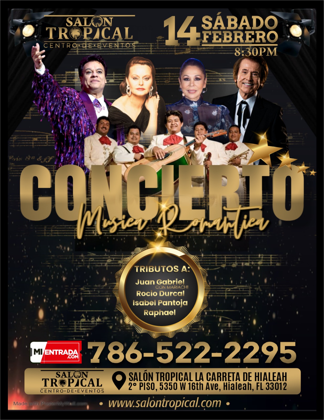 Home Events CONCIERTO MÚSICA ROMANTICA CONCIERTO MÚSICA ROMANTICA LLAMA YA! 786 522 2295 COMPRAR TICKET: https://ci.ovationtix.com/36625/production/1265142?performanceId=11761366 + Add to Google Calendar + iCal / Outlook export 00 days 00 hours 00 minutes 00 seconds Tags: DESTACADO Date Feb 14 2026 Time 8:00 pm - 11:00 pm More Info COMPRAR ENTRADAS Location Salón Tropical 5350 W 16th Ave, Hialeah, FL 33012 Category CONCIERTO COMPRAR ENTRADAS Share this event